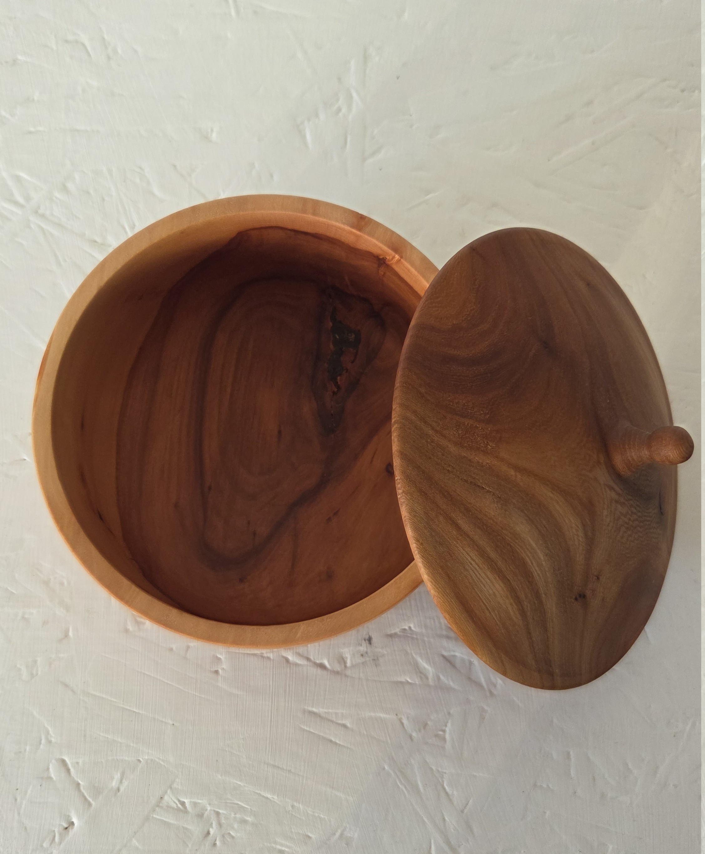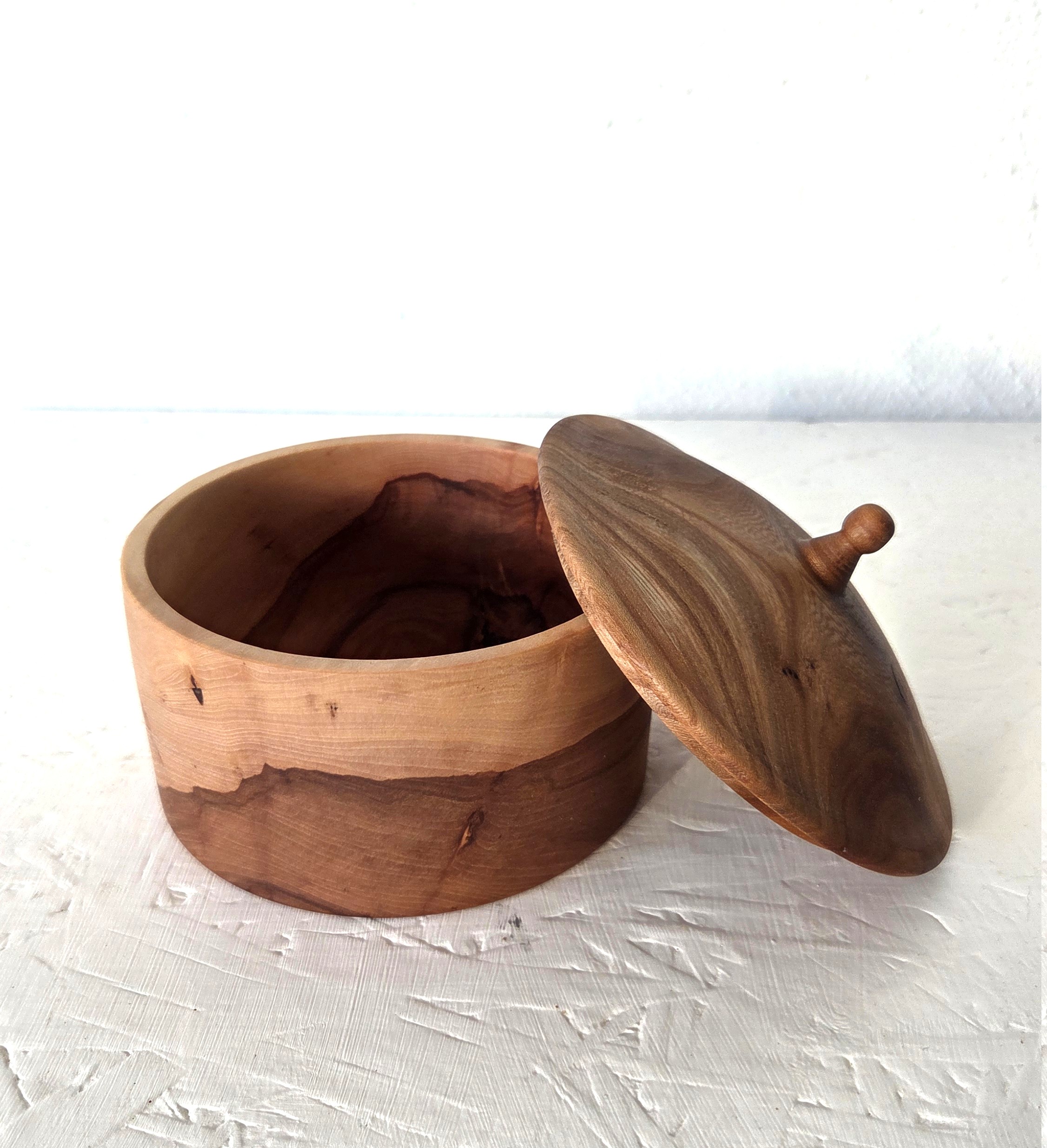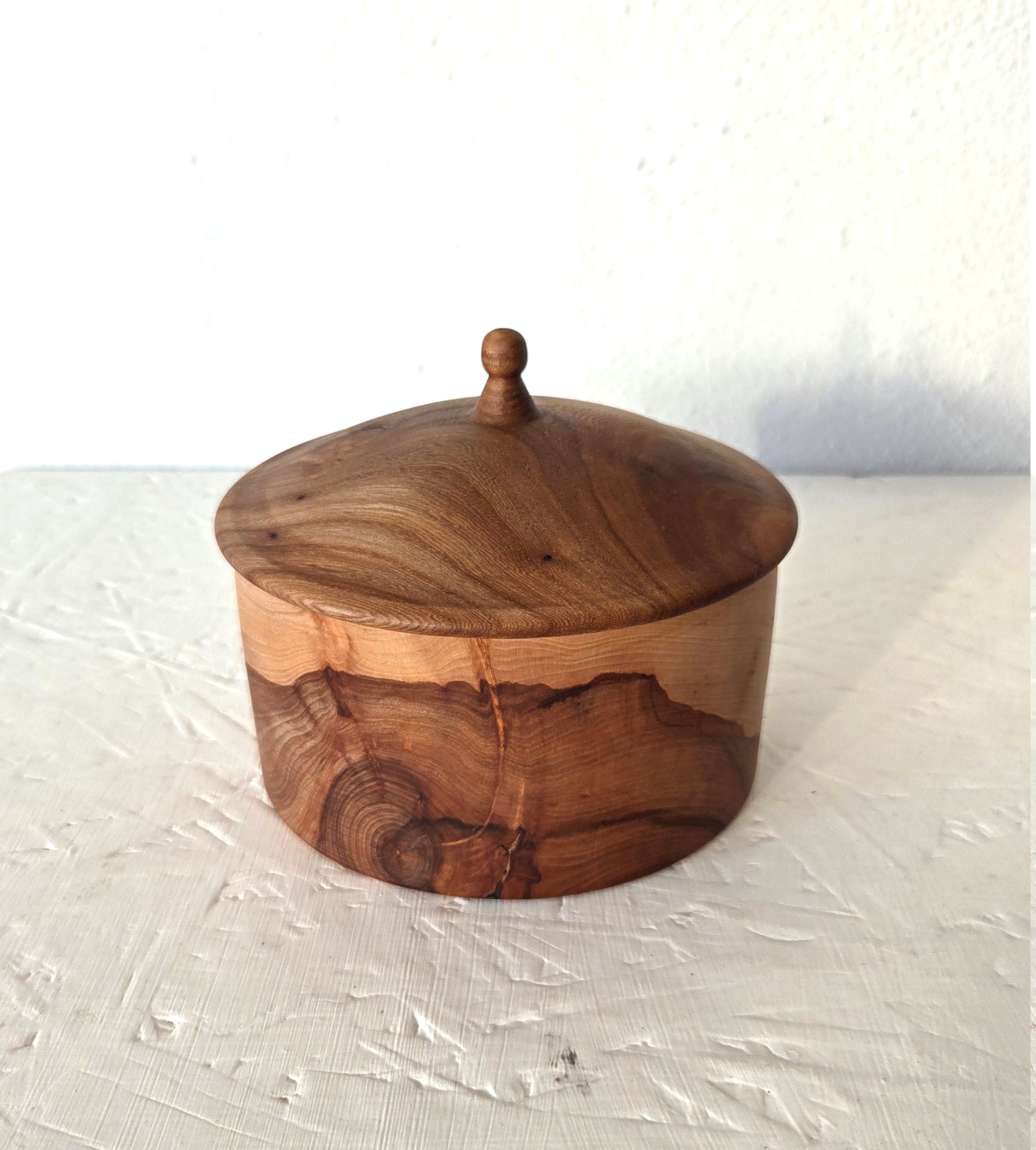 Lågkrukke, krukke i skovfogedæbletræ og låg i elm. Ø 14,5 cm, H 10 cm